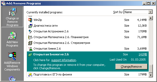 Если вы хотите удалить курс «Открытая Биология 2.6», закройте программу и зайдите в главном меню Windows в раздел (). Выберите в открывшемся списке программу «Открытая Биология 2.6».