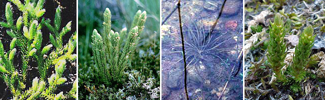 | Рисунок 4.2.4.2. Современные плауновидные. Слева направо: плаун булавовидный, плаун-баранец, селагинелла селаговидная, полушник озёрный |