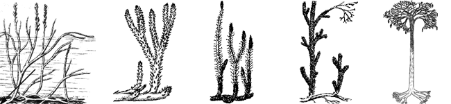 | Рисунок 4.2.4.3. Древние плауновидные. Слева направо: зостерофиллофит, дрепанофикус, протолепидодендрон, астероксилон, лепидодендрон |